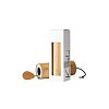 Цилиндрический корпус инструмента изготовлен из тонких слоев бамбука и обработан натуральным маслом. Цилиндр имеет диаметр 6,3 см и высоту 16,5 см.