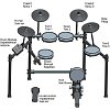 Электронная ударная установка. 10” сетчатый двухзонный малый барабан, 8” сетчатые двухзонные томы (2шт), 10” сетчатый двухзонный напольный том, 8” сетчатый пэд бас-барабана. 12” двухзонные тарелки (3шт: hi-hat, crash1, crash2). 13” трехзонная тарелка Ride. Стойка хай-хета. Педаль для бас-барабана. Прочная и устойчивая алюминиевая рама. 30 пресетов барабанных установок. 467 звуков барабанов, тарелок и перкуссии. 15 встроенных аккомпанементов. Рекордер. Метроном. Входы: CD/MP3/Aux , USB/MIDI, Лине